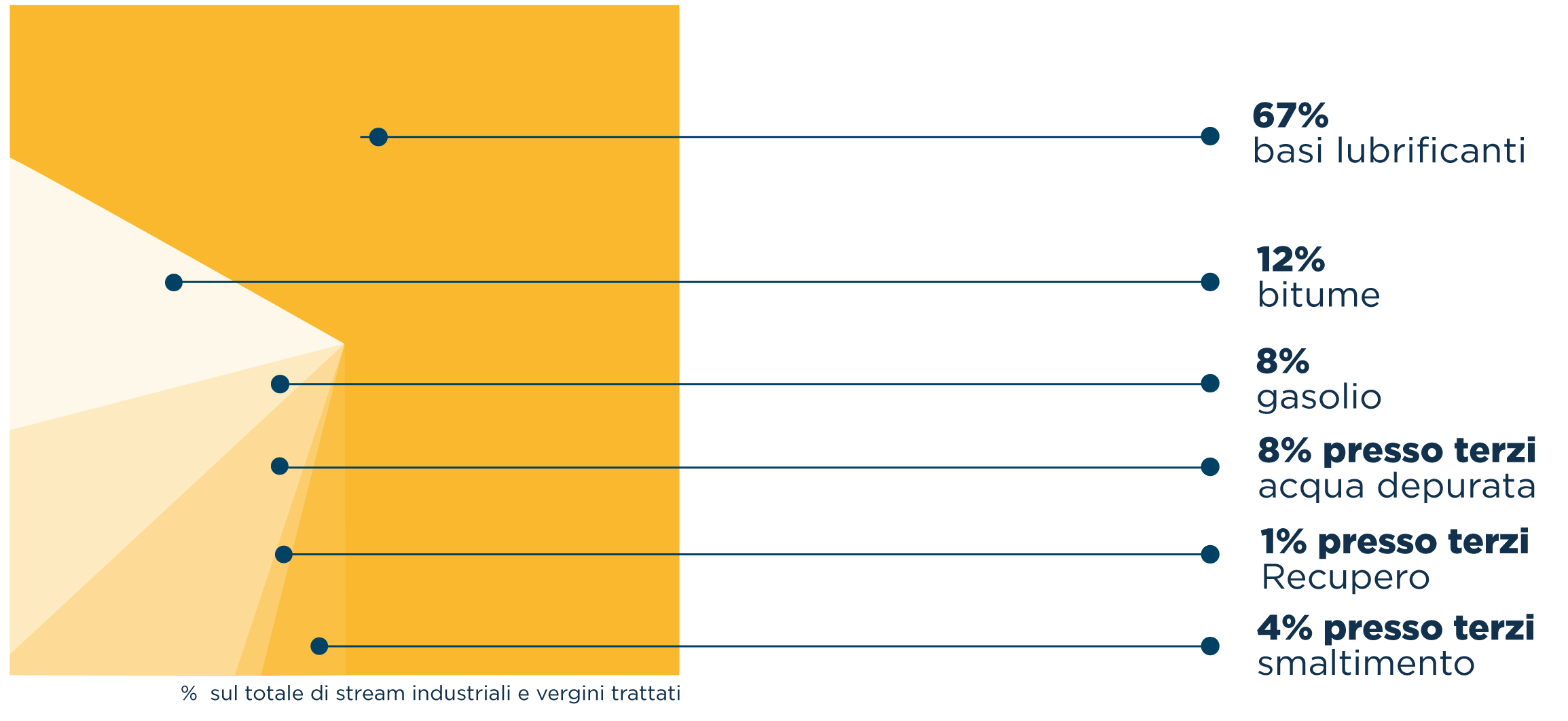 I processi di rigenerazione consentono di ottenere un altissimo rendimento: da 100 kg di olio usato si generano in media 67 kg di basi rigenerate, 20 kg circa di bitume e gasolio e 8 kg di acqua restituita all’ambiente completamente purificata. Solo i rimanenti 5 kg vengono inviati a terzi autorizzati per possibili ulteriori valorizzazioni.